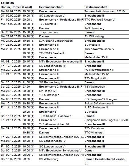Die Saison beginnt wieder zum September 2025. Zum Spielbetrieb siehe folgenden Link: https://www.mytischtennis.de/clicktt/TTVN/25-26/verein/2192260/SSV-Kirchhorst/mannschaften/